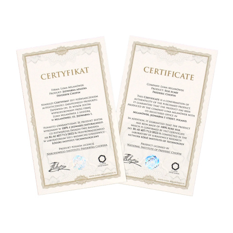 Each scarf comes with a certificate of authenticity confirming it is made from 100% natural silk and produced by our company. The certificate includes a unique number visible only under UV light, a hologram, and the Luma Milanówek logo, and is bilingual (Polish-English).