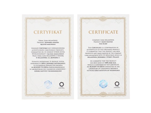 Każdy nasz ręcznie malowany produkt jest unikatowy i różni się od pierwowzoru, który widoczny jest na zdjęciu. Przy zamówieniu należy się liczyć z tym, że dostarczona apaszka lub szal może lekko różnić się kolorystycznie od tej na zdjęciu. Na postrzeganie kolorów mają wpływ ustawienia m.in. kontrastu oraz jasności monitora jak również natężenie i barwa światła w jakim robimy zdjęcie produktom jedwabnym. Wreszcie samo powielanie wzorów florystycznych czy geometrycznych nigdy nie jest robione na podstawie szablonu. Każda linia jest unikalna, każdy kwiatek jest inny, jak również ilość elementów nie zawsze jest taka sama na tym samym modelu. Prosimy o wzięcie pod uwagę specyfiki procesu realizacji produktów "hand made" i akceptację niewielkich odstępstw.