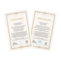 Do każdej apaszki dołączony jest certyfikat autentyczności. Dokument ten potwierdza, że produkt jest wykonany ze 100% jedwabiu naturalnego, a także jest dowodem, że produkt powstał w naszej firmie. Każdy certyfikat posiada indywidualny numer widoczny tylko przy specjalnym świetle UV, tłoczony znak halograficzny oraz nasze logo. Certyfikat jest dwujęzyczny (polsko-angielski) i daje gwarancję najwyższej jakości zakupionego produktu.