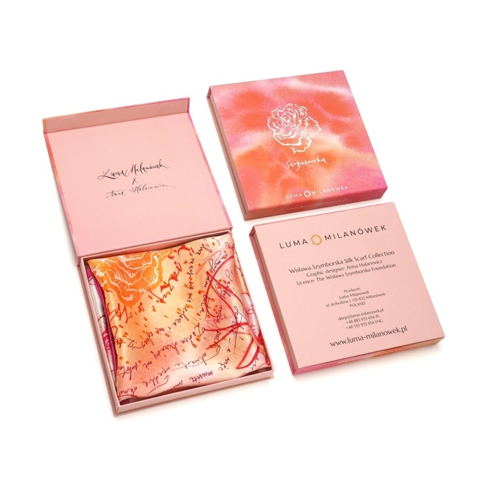 A pastel pink scarf with accents of red and orange from the Great Poles Collection depicts key motifs from the poem, including a rose and water drops, symbolizing romantic feelings and the differences between the text's characters. Halarewicz's design captures the sensitivity of the piece, which – as Wisława Szymborska herself claimed – is the only one in her oeuvre that lends itself exceptionally well to singing, as evidenced by its numerous musical interpretations.