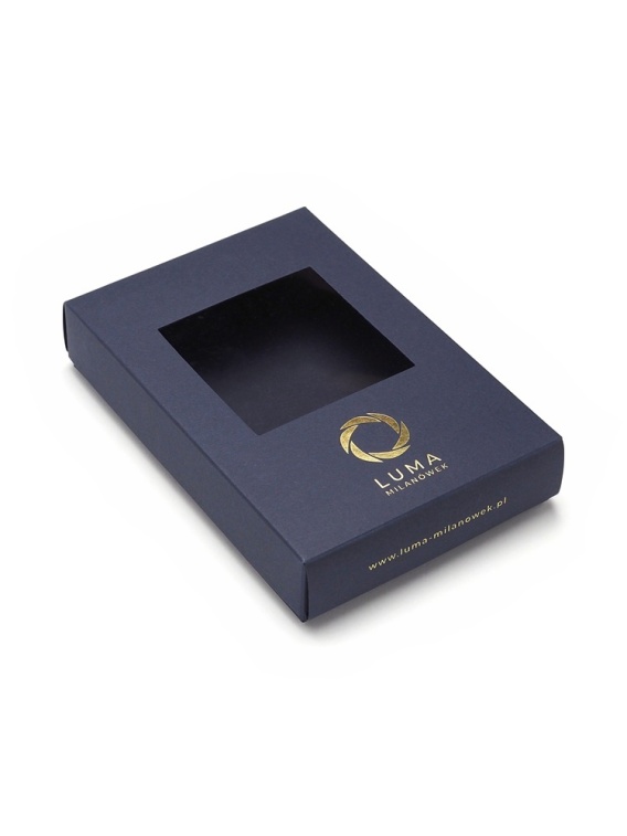 Pudełko prezentowe to idealny sposób na eleganckie i stylowe zapakowanie podarunków. Wykonanie z kartonu barwionego w masie, w kolorze granatowym nadaje mu przyjemny i luksusowy wygląd. Na wieczku umieszczone jest złocone logo Luma Milanówek i adres strony www, dodając jeszcze więcej elegancji.