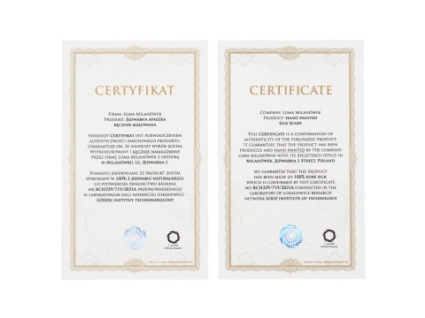 Każdy nasz ręcznie malowany produkt jest unikatowy i różni się od pierwowzoru, który widoczny jest na zdjęciu. Przy zamówieniu należy się liczyć z tym, że dostarczona apaszka lub szal może lekko różnić się kolorystycznie od tej na zdjęciu. Na postrzeganie kolorów mają wpływ ustawienia m.in. kontrastu oraz jasności monitora jak również natężenie i barwa światła w jakim robimy zdjęcie produktom jedwabnym. Wreszcie samo powielanie wzorów florystycznych czy geometrycznych nigdy nie jest robione na podstawie szablonu. Każda linia jest unikalna, każdy kwiatek jest inny, jak również ilość elementów nie zawsze jest taka sama na tym samym modelu. Prosimy o wzięcie pod uwagę specyfiki procesu realizacji produktów "hand made" i akceptację niewielkich odstępstw.