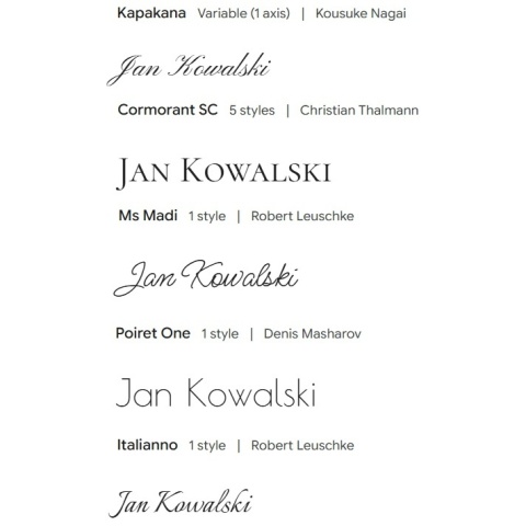 Oferujemy możliwość personalizacji pióra poprzez dodanie graweru na skuwce. Możemy umieścić tekst do 15 znaków, o maksymalnych wymiarach 1x4 cm. Grawer jest dodatkowo płatny w cenie 100 zł. Aby domówić grawer, wystarczy wpisać treść do 15 znaków w nieobowiązkowe pole "Dodaj treść graweru:" i wybrać preferowaną czcionkę z rozwijanej listy. Dostępne czcionki są pokazane poniżej. Jeśli chcesz zobaczyć jak Twój napis będzie wyglądał w wybranej czcionce kliknij w hiperłącze podpięte do wybranej czcionki. W nowym oknie otworzy się strona Google Fonts, na której w polu "Type here to preview text" należy wpisać swoją treść. Możesz wybrać jedną z następujących czcionek: Kapakana, Cormorant SC, Ms Madi, Poiret One, Italianno.