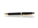 Korpus długopisu wykonano z solidnego materiału w szlachetnym złotym wykończeniu. Smukła forma i delikatnie połyskująca powierzchnia dodają mu elegancji i prestiżu. Głównym elementem ozdobnym jest ręcznie osadzony czarny agat na skuwce – jego głęboka, lśniąca czerń kontrastuje z blaskiem złota, tworząc wyrafinowaną i nowoczesną kompozycję.
