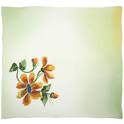 Every large silk shawl from our collection is crafted through a meticulous hand-painting process on fabric, bestowing it with unparalleled character. The orange floral motifs against the subtle green background draw the eye, add energy, and make this large women's shawl the focal point of any look. Small variations in color and pattern placement are a natural feature—each piece is unique.