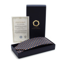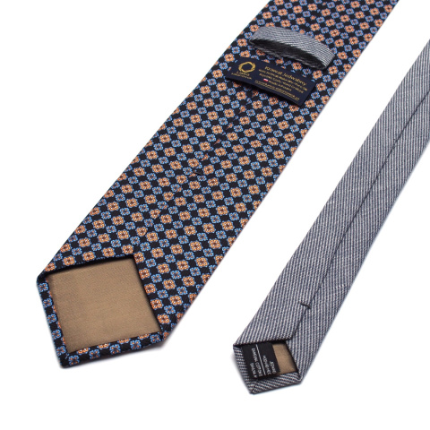 The Italian pattern has many characteristic features that make it unique in the world of fashion and design, just like this navy blue men's tie. Its geometric arrangement of figures is often based on asymmetry, which gives it a modern look. Coordinated colors, which can combine intense colors with more subdued shades, add elegance and style. Additionally, the Italian pattern draws inspiration from current trends, which makes Italian silk ties up to date and constantly changing, adapting to current fashion trends.
