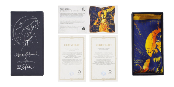 A men's pocket square with the zodiac sign is also a perfect idea for a matching gift. Each product from the collection is packed in dedicated, elegant boxes that emphasize the quality and uniqueness of the gift. It is also possible to make a handwritten dedication on silk, which is a unique, personalized detail.