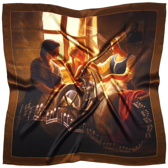 The scarf's design was created using a printing technique, yet its character evokes exquisite, hand-painted paintings. The illustration depicts a poetic scene inspired by a composition by Stanisław Moniuszko. The song for voice and piano, "Prząśniczka," imagines women spinning a silk thread that gradually transforms into sounds and musical notes. This extraordinary metamorphosis symbolizes not only Moniuszko's music but also the magical process of creation – the moment when matter transforms into art, and art transforms into something that can move the world.