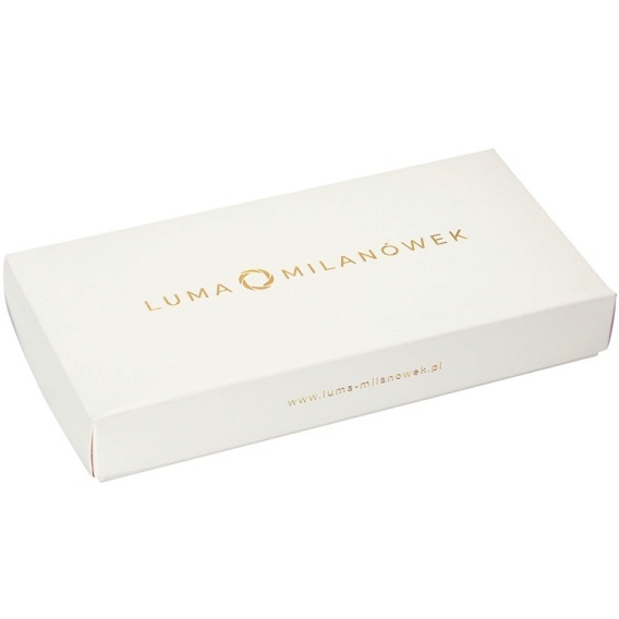 The box consists of two parts - a lid and a bottom. It is made of special, exclusive cardboard with very high stiffness. The logo was applied using the Hot Stamping technique, i.e. embossing using a matrix with a gold finish, giving the box a special and unique character. The color of the box combined with gold plating gives it a prestige and luxurious look. Silk accessories in such packaging look extremely elegant and tasteful.