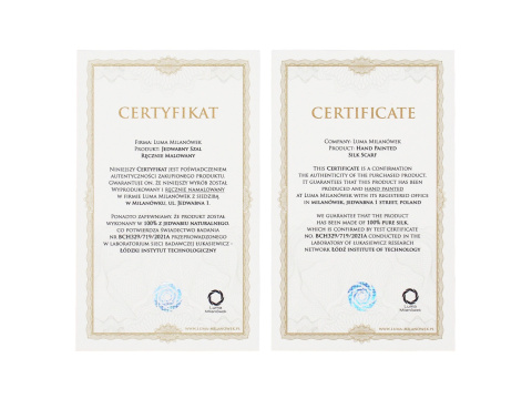 Każdy nasz ręcznie malowany produkt jest unikatowy i różni się od pierwowzoru, który widoczny jest na zdjęciu. Przy zamówieniu należy się liczyć z tym, że dostarczona apaszka lub szal może lekko różnić się kolorystycznie od tej na zdjęciu. Na postrzeganie kolorów mają wpływ ustawienia m.in. kontrastu oraz jasności monitora jak również natężenie i barwa światła w jakim robimy zdjęcie produktom jedwabnym. Wreszcie samo powielanie wzorów florystycznych czy geometrycznych nigdy nie jest robione na podstawie szablonu. Każda linia jest unikalna, każdy kwiatek jest inny, jak również ilość elementów nie zawsze jest taka sama na tym samym modelu. Prosimy o wzięcie pod uwagę specyfiki procesu realizacji produktów "hand made" i akceptację niewielkich odstępstw.