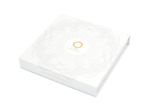 Gift packaging with a logo, white - PLN 6. Elegant packaging made of mass-dyed cardboard in a white color with gilding. |