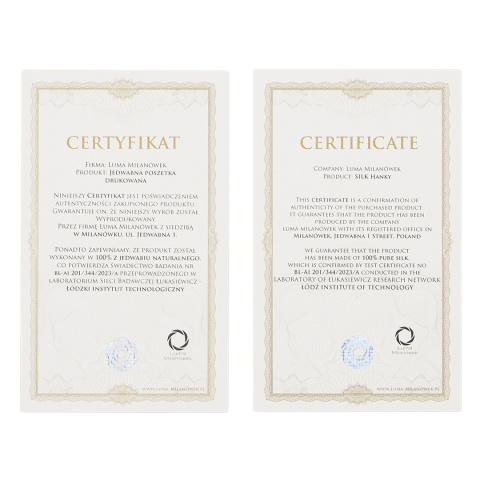 Do każdej poszetki dołączony jest Certyfikat Autentyczności. Dokument ten potwierdza, że jedwabna poszetka jest wykonana ze 100% jedwabiu naturalnego, a także potwierdza, że produkt powstał w naszej firmie. Każdy certyfikat posiada indywidualny numer widoczny tylko przy specjalnym świetle UV, tłoczony znak halograficzny oraz nasze logo. Certyfikat jest dwujęzyczny (polsko-angielski) i daje gwarancję najwyższej jakości zakupionego produktu.