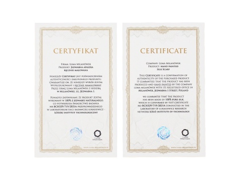 Każda chustka gawroszka jest unikatowa i różni się od pierwowzoru, który widoczny jest na zdjęciu. Przy zamówieniu należy się liczyć z tym, że dostarczona apaszka do marynarki może lekko różnić się kolorystycznie od tej na zdjęciu. Na postrzeganie kolorów mają wpływ ustawienia m.in. kontrastu oraz jasności monitora jak również natężenie i barwa światła w jakim robimy zdjęcie produktom jedwabnym. Wreszcie samo powielanie wzorów florystycznych czy geometrycznych nigdy nie jest robione na podstawie szablonu. Każda linia jest unikalna, każdy kwiatek jest inny, jak również ilość elementów nie zawsze jest taka sama na tym samym modelu. Prosimy o wzięcie pod uwagę specyfiki procesu realizacji produktów "hand made" i akceptację niewielkich odstępstw.