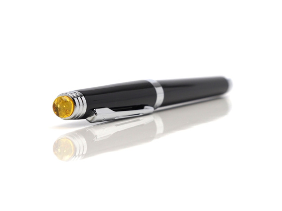 Długopis z bursztynem ma elegancki czarny korpus z dodatkami w kolorze srebra, co nadaje mu ponadczasowy stylowy wygląd. Na skuwce umieszczono naturalny złoty bursztyn – kamień szlachetny o ciepłej, złocistej barwie i niepowtarzalnym rysunku. Każdy fragment bursztynu jest inny, co sprawia, że każdy elegancki długopis jest unikatowy.
