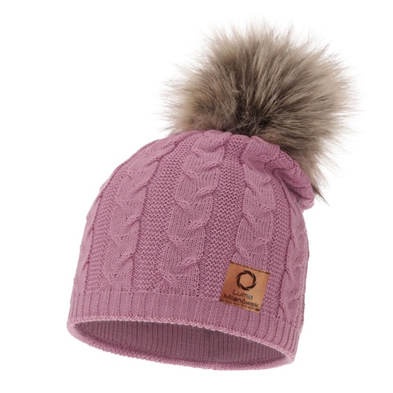 Czapka wełniana damska fiolet z pomponem, warkoczowy splot